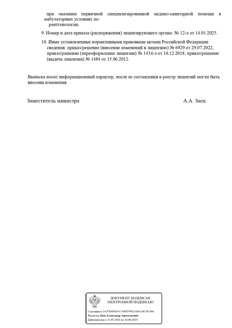 Занимается рентгенодиагностикой органов брюшной полости, опорно-двигательной системы, ЛОР органов, органов ЖКТ, исследования органов брюшной полости и забрюшинного пространства, таза, грудной клетки, позвоночника, шеи, суставов и костей.